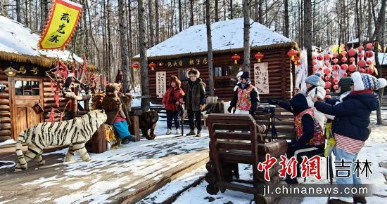 愛心玫瑰與雪人谷成為打卡熱點,百余個創(chuàng)意雪人錯落分布,雪雕玫瑰形態(tài)各異,游客爭相合影。關(guān)東文化園威虎山土匪寨角色扮演區(qū)人氣爆棚,游客換上土匪服飾,手持道具槍模擬“打土匪”互動,笑聲與吶喊聲中重現(xiàn)歷史場景。“這比單純滑雪更有意思!”游客王先生興奮地表示,“土匪寨體驗讓我仿佛穿越回關(guān)東時代,文化元素讓冰雪活動更鮮活。”