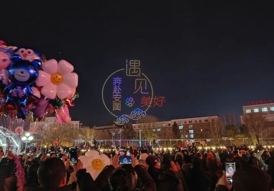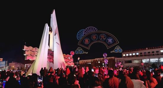 隨后,萬(wàn)眾期待的無(wú)人機(jī)表演正式亮相,千余架無(wú)人機(jī)在夜空中緩緩升空,隨著音樂(lè)節(jié)奏不斷變換造型,“元宵”“飛馳的駿馬”“翱翔天空的巨龍”等圖案,“喜樂(lè)元宵”“遇見美好奔赴安圖”等字樣在夜空中次第呈現(xiàn),勾勒出唯美浪漫的立體畫面,引得現(xiàn)場(chǎng)觀眾紛紛舉起手機(jī),記錄下這一震撼而美好的瞬間。