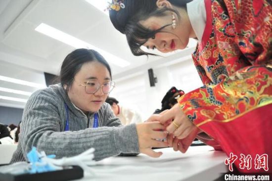 1月23日,巫珮瑄(左)在吉林長春學(xué)習(xí)制作漢服手工仿絨花雪花胸針。
