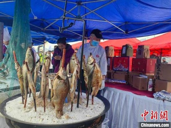4月28日,吉林市松花湖開江魚美食節(jié)旅游季拉開帷幕,廚師現(xiàn)場(chǎng)烹魚吸引游客!∈橛 攝
