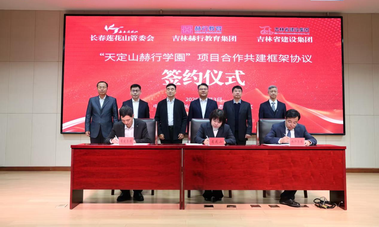 2月3日9時許,長春蓮花山生態(tài)旅游度假區(qū)管委會的一間會議室內(nèi),三份文件在多方見證下簽署完成。度假區(qū)黨工委書記、管委會主任王彪,吉林赫行教育集團董事長李志兵,吉林省建設(shè)集團董事長江禮成的手握在一起。
