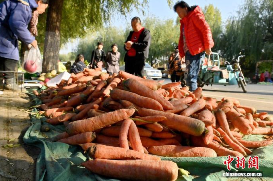 10月16日,吉林長(zhǎng)春,市民在挑選胡蘿卜。當(dāng)下正是中國(guó)東北民眾“囤秋菜”的季節(jié),滿載大蔥、白菜、胡蘿卜等秋菜的貨車(chē)?吭陂L(zhǎng)春市區(qū)指定銷(xiāo)售區(qū)域,市民們穿梭挑選,忙碌地儲(chǔ)備過(guò)冬秋菜。中新社記者 張瑤 攝