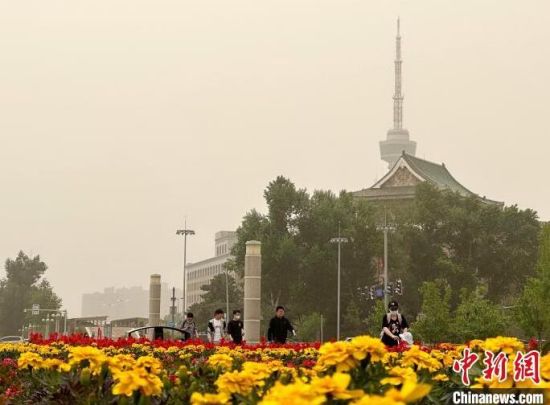 長春文化廣場雕塑!」选z市民在公園散步!」选z城市上空昏黃一片。 郭佳 攝沙塵天氣使能見度降低!」选z城市綠樹被沙塵籠罩!」选z
