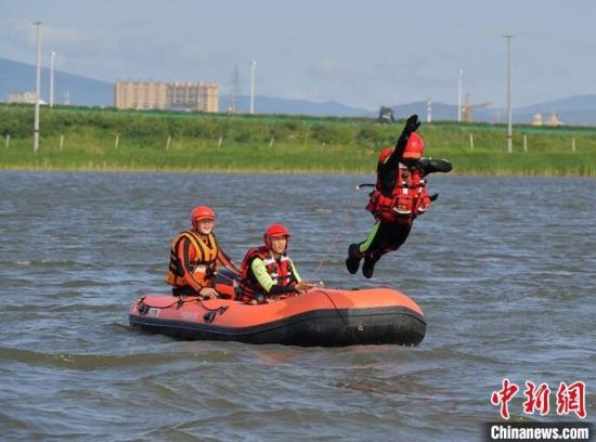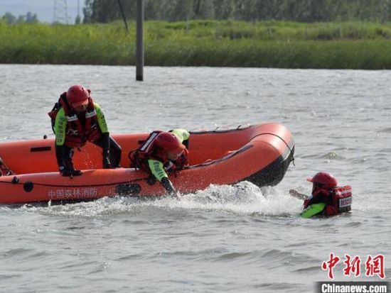 森林消防員正在進行水上救援科目訓(xùn)練。