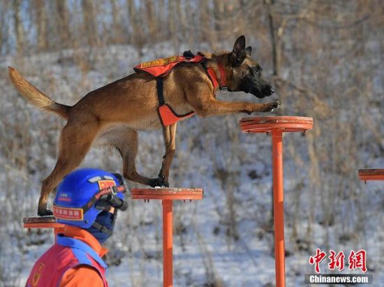 搜救犬正在進(jìn)行跳木圈訓(xùn)練。