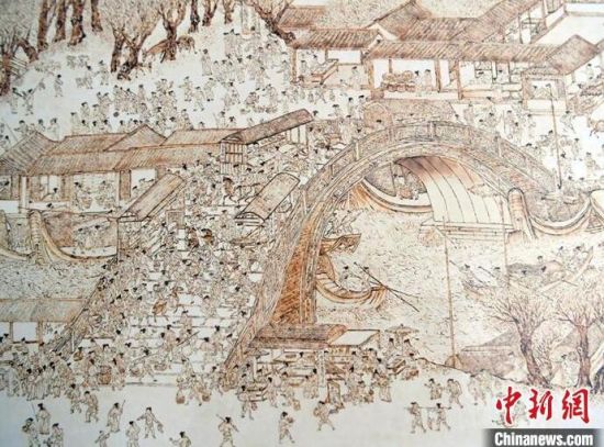 王巖正在查看作品中的細節(jié)。王巖正在創(chuàng)作烙畫作品。王巖正在創(chuàng)作烙畫作品。王巖正在創(chuàng)作烙畫作品。王巖用烙畫技術臨摹的明代清明上河圖。