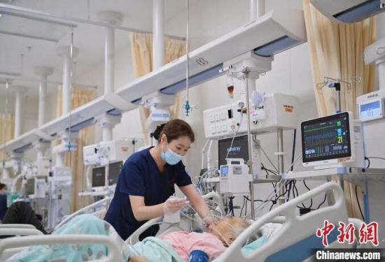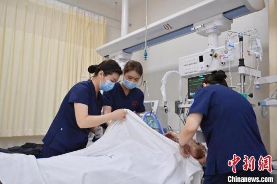 張力(左)對急診監(jiān)護區(qū)每位患者的情況都爛熟于心。護士們與患者朝夕相處,細心照護,關(guān)系已經(jīng)超出了普通的醫(yī)患關(guān)系。張力說:“他們的親屬不能在身邊陪伴,但是我們每天可以和他們在一起,我們和這些患者的關(guān)系像親人一樣! 張瑤 攝