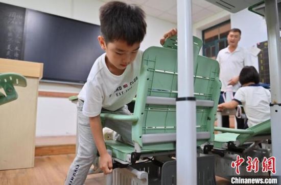 9月5日,在長春南湖實驗中海小學(xué),學(xué)生們在“可躺式”課桌椅上午睡。目前,吉林省有多所學(xué)校已啟用“可躺式”課桌椅,學(xué)生們中午可以躺著休息。中新社記者 張瑤 攝
