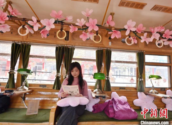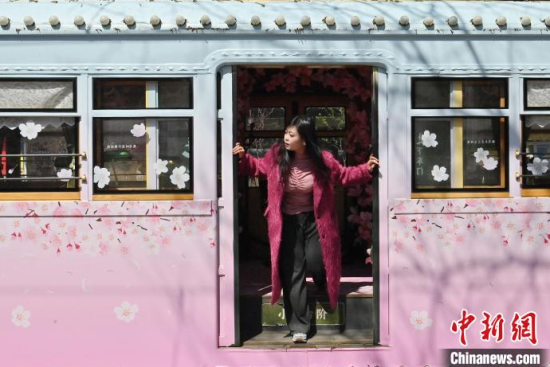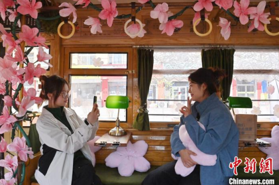 4月18日,吉林長春,游客在54路文旅春日限定專列上拍照留念。該專列車廂內(nèi)外融入了桃花的設計元素,營造出濃郁的春意,吸引了眾多游客前來打卡。中新社記者 張瑤 攝