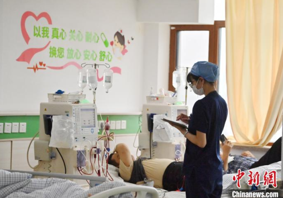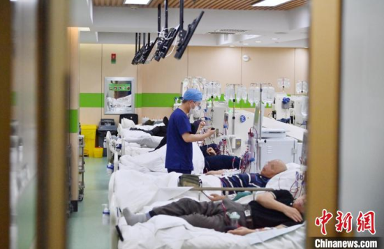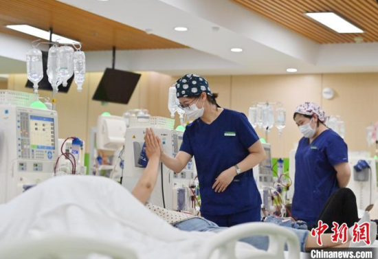 5月9日,長春中醫(yī)藥大學(xué)附屬醫(yī)院腎病科透析室內(nèi),護(hù)士在為患者進(jìn)行透析治療。該科室日均接診近200名患者,每位患者的透析過程都需要數(shù)小時。治療期間,護(hù)士們會全程密切監(jiān)測患者生命體征,隨時準(zhǔn)備應(yīng)對突發(fā)狀況。多年來,醫(yī)護(hù)團(tuán)隊以專業(yè)的技能和細(xì)致的關(guān)懷,持續(xù)為患者的生命健康保駕護(hù)航。中新社記者 張瑤 攝