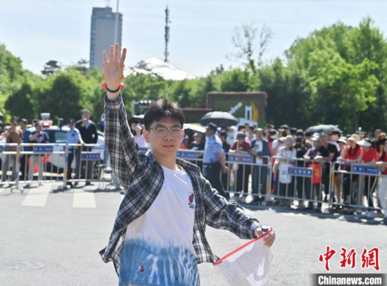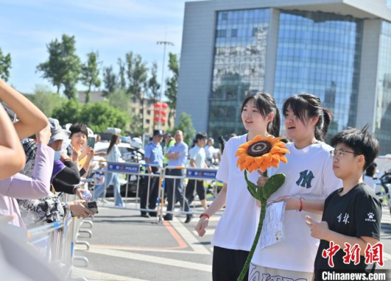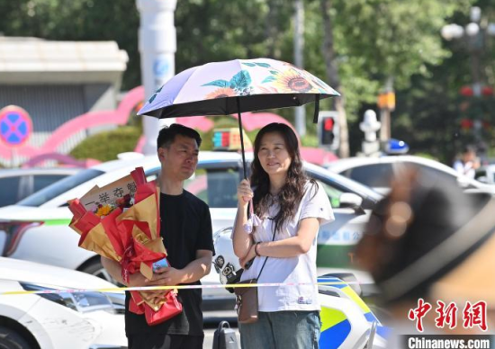 6月7日,吉林省長(zhǎng)春市,在吉林省實(shí)驗(yàn)中學(xué)考點(diǎn),陪考人員為考生加油。當(dāng)日,2025年全國(guó)高考拉開帷幕。中新社記者 張瑤 攝