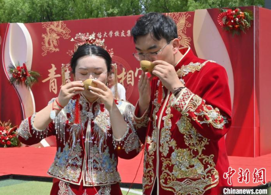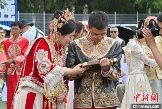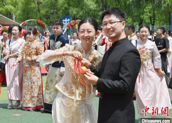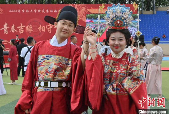 6月21日,吉林大學中心校區(qū)舉行2025年校友集體婚禮,36對新人從四面八方相聚在母校,在眾人矚目下有序步入婚禮主舞臺,沿途得到學弟學妹們的熱情祝福。中新社記者 張瑤 攝
